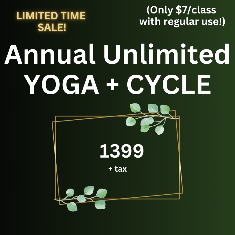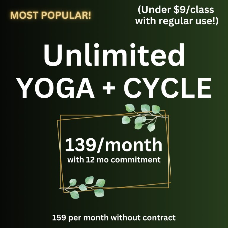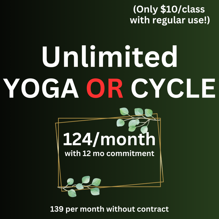 Ask about our one-time offer for new members at the end of the trial period! $129 auto-monthly for unlimited yoga and cycling classes (1 year commitment) or $25 off a 15 class card.